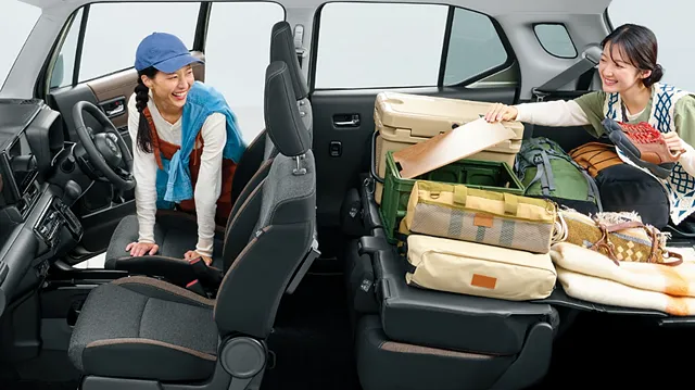 室内は、前席、後席、荷室のすべてが余裕のある広さで4人がゆったり乗って、さらにたくさんの荷物を積める空間があります。リヤシートは左右独立スライド機構付きです。足元にゆとりがあり、リクライニング機構と合わせて快適に過ごせます。