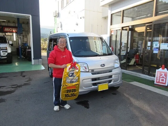 本日のご納車はスバル サンバーバンです。ターボの快適な加速と走行はもちろん、パワースライドドアウェルカムオープン機能などの便利な機能が搭載されていて、普段のドライブからお仕事まで幅広く活躍してくれそうですね。メンテナンスを含め今後ともよろしくお願いいたします。(2025/10/30)