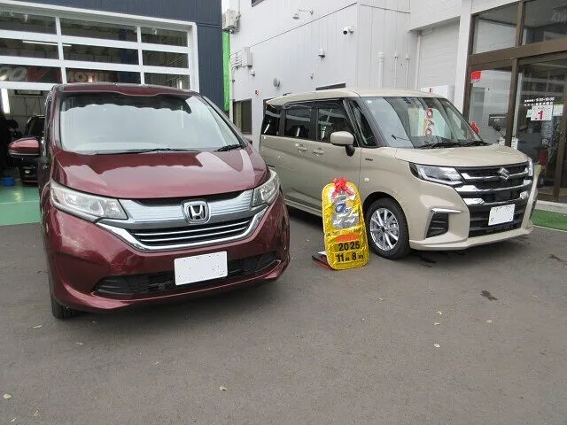 本日のご納車はスズキ ソリオハイブリッドです。フリードからのお乗り換えによって全長が短くなった分、小回りが利き街中や駐車場での取り回しが楽になりますね。室内の高さも十分にあり、ゆったりと快適なドライブを楽しめそうですね。メンテナンスを含め今後ともよろしくお願いいたします。(2025/11/8)