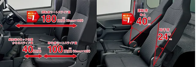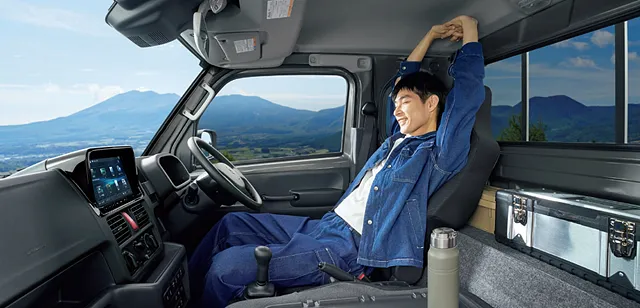 大柄な方でもゆとりの運転姿勢をとれるシートスライド&リクライニングが特徴のスーパーキャリィ。またハイルーフ化で頭上の空間が確保され広々とした開放感を感じられます。