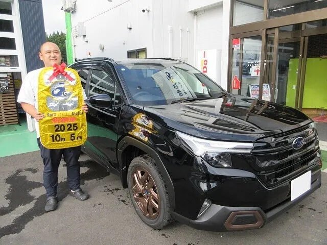 本日のご納車はスバル フォレスターです。納車まで大変お待たせいたしました。タフで力強いデザイン、静寂性が大幅に向上した室内とアイサイト搭載で長距離ドライブも疲れにくく快適なドライブを楽しめそうですね。高速道路から悪路や雪道まであらゆるシーンでスバルのスポーティな走りを愉しめることと思います。メンテナンスを含め今後ともよろしくお願いいたします。(2025/10/5)